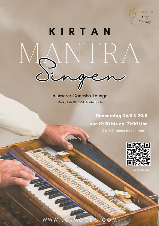 Ihr seid alle herzlich eingeladen amAn 2 Donnerstag Abenden um 19:30Uhr bis ca. 21:00Uhr in unserer Ganesha Yoga Lounge an unserem gemeinsamen Mantrasingen teilzunehmen. Bei Kerzenschein und Tee werden wir zusammen wunserschöne von “Sundram” aber auch von mir komponierte Mantren singen. Die Mantren werde ich auf dem indischen Harmonium begleiten. Die (sehr kurzen) Texte der Mantren werden zur Verfügung gestellt und jeder ist eingeladen mitzusingen, mitzusummen, zu tanzen, oder einfach nur zuzuhören. Ich feue mich auch Euch! Namasté Marcus Die Anmeldung/Teilnahme ist kostenfrei. Wir würden uns aber sehr über einen kleinen Energieausgleich (vor Ort) freuen.